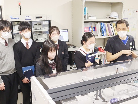 近畿大学附属新宮高校は16日、医療ゼミの一環として那智勝浦町立温泉病院の見学を行った。2年生10人が参加し、医局や看護部門、リハビリセンター、検査部門などを見学。その後、本校卒業生で同病院内科医の矢本大洋さんから地域医療について... 続きを読む
