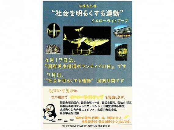 「国際更生保護ボランティアの日」の17日、犯罪のない幸福で明るい社会を願って、更生保護のイメージカラーである黄色にちなんだ「イエローライトアップ」が和歌山県内8か所で行われる。昨年に続き2回目で、新宮・東牟婁地方では4か所で予定... 続きを読む
