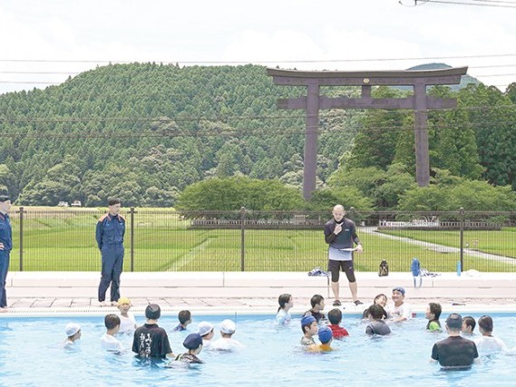 田辺市立本宮小学校と三里小学校は17日、同市本宮町の世界遺産センター内、熊野本宮大社旧社地・大斎原(おおゆのはら)の大鳥居が望めるプールで、2校合同による5・6年生を対象とした着衣水泳教室を、田辺消防署本宮分署の隊員を講師に迎え... 続きを読む