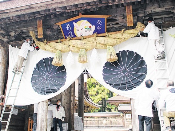 田辺市本宮町の熊野本宮大社で1日、神門の大絵馬と大しめ縄の掛け替え作業が行われ、迎春準備を整えた。 大絵馬は九鬼家隆宮司が自ら来年の干支(えと)「癸卯」(みずのとう... 続きを読む