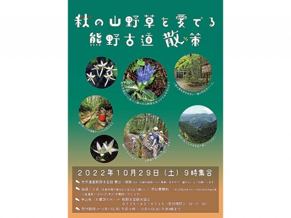 田辺市本宮町、熊野本宮観光協会は10月29日(土)午前9時に世界遺産熊野本宮館集合で、講師の瀧野秀二氏(熊野自然保護連絡協議会会長)と発心門コースを散策する「秋の山野草を愛でる熊野古道散策」を開催するにあたり、参加者を募集する。... 続きを読む