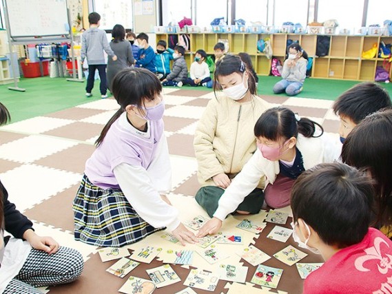 自作のカルタで遊ぶ 「きほっこ」の児童ら