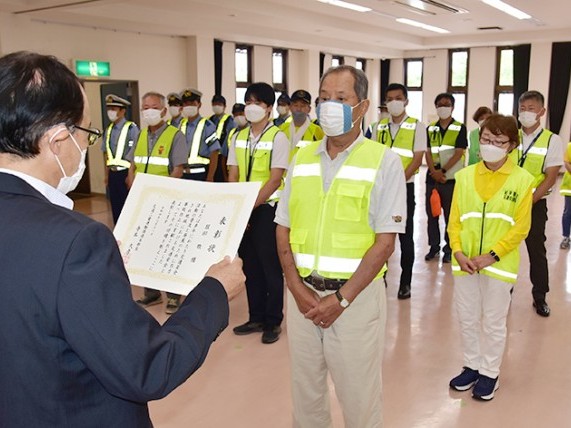 功労者の4人を表彰 夏の交通安全県民運動初日の11日、三重県紀北地域活性化局や尾鷲市、紀北