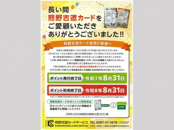 紀北町内の加盟店で利用できる「熊野古道カード」のポイント発行が8月末で終了する。熊野古道カードサービスはポイント有効期限後に解散する。 熊野古道カードは町内の加盟店で買い物すると... 続きを読む