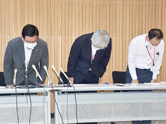 会見で謝罪する尾上町長(左)、中場副町長(中央)ら