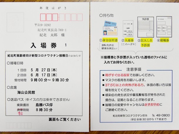 紀北町は18日から、高齢者向けの新型コロナウイルス集団接種の入場券のハガキを発送している。接種は海山公民館で5月27日(木)から、東長島公民館で6月3日(木)から行われる予定で、申し込みした人のうち年齢の高い順から順次、接種日の... 続きを読む