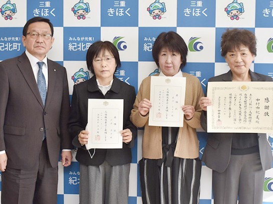 紀北町役場で19日、人権擁護委員感謝状伝達式と委嘱状交付式が行われた。昨年末退任した中村由紀美さん(69)=島勝浦=に感謝状、今年から委嘱された直江ひとみさん(58)=相賀=と石原澄子さん(63)=東長島=に委嘱状が尾上壽一紀北... 続きを読む