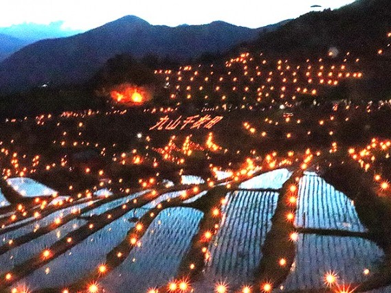 熊野市紀和町丸山区の伝統行事「丸山千枚田の虫おくり」が8日夜に開かれた。「虫おくり殿のお通りだい」とかけ声が響く中、棚田の数と同じ、1340個のキャンドルが灯(とも)ると、夕暮れの棚田を照らし出し、来場した約1200人が目をうば... 続きを読む