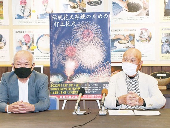 記者発表する熊野大花火研究部会の金本会長(左)と熊野市観光協会の中平会長