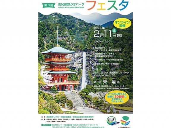 南紀熊野ジオパーク推進協議会と環境省近畿地方環境事務所は、2月11日(金・祝)午後1時~3時30分、「第9回南紀熊野ジオパークフェスタ」をオンライン配信で開催する。 ... 続きを読む