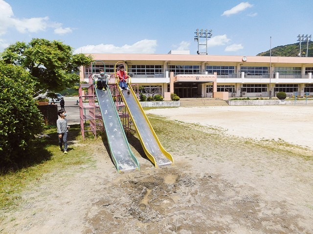 マスクを着用しながら遊ぶ児童(23日、相野谷小学校)