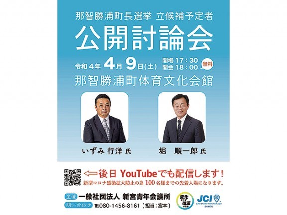 今月19日(火)告示、同24日(日)投開票の日程で行われる那智勝浦町長選挙を前に、新宮青年会議所(新宮JC)主催による公開討論会が9日(土)午後6時から7時30分まで(開場は5時30分)、同町天満の町体育文化会館大会議室で開催さ... 続きを読む