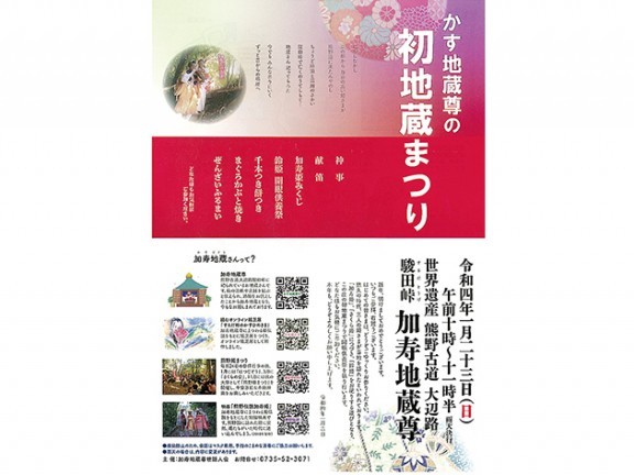 加寿地蔵尊世話人会が主催する初地蔵まつりが23日(日)午前10時~11時30分(雨天決行)、那智勝浦町の熊野古道大辺路「駿田峠」にある加寿地蔵尊で行われる。 今回の初地蔵まつりでは、「開眼供... 続きを読む