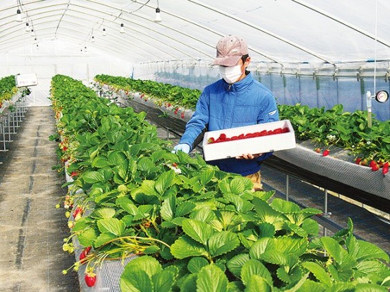 イチゴ「まりひめ」を栽培している下里圃場のビニールハウス(写真は組合職員)