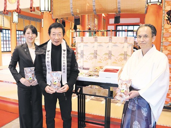 那智勝浦町の熊野那智大社(男成洋三宮司)で12日、新宮市三輪崎の株式会社髙岡商店による「鰹焼節ゆず醤油味」と「勝浦産生マグロ」の奉納があった。同社長の髙岡陽市朗さんと妻で取締役の香さんが参列し、一年の感謝に祈りを込めた。... 続きを読む