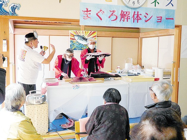 那智勝浦町朝日のデイサービス(地域密着型通所介護)施設「かいてきライフ ハピネス」は11日、マグロの解体ショーを行った。 施設利用者とその家族や近隣住民も集まる中、... 続きを読む