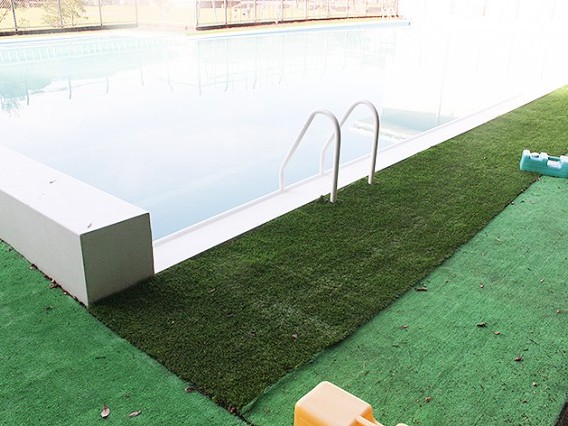 人工芝敷で快適に 那智勝浦町立宇久井小学校は6日、同校敷地内のプールの補修工事を無償で行っ