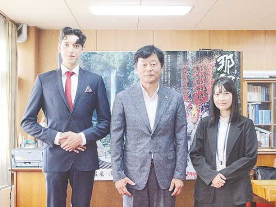 堀町長を表敬訪問したマーティンさん(左)とブリタンティアさん(右)