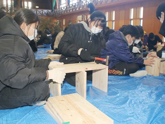 くぎを打ってヒノキの本棚を組み立てる6年生