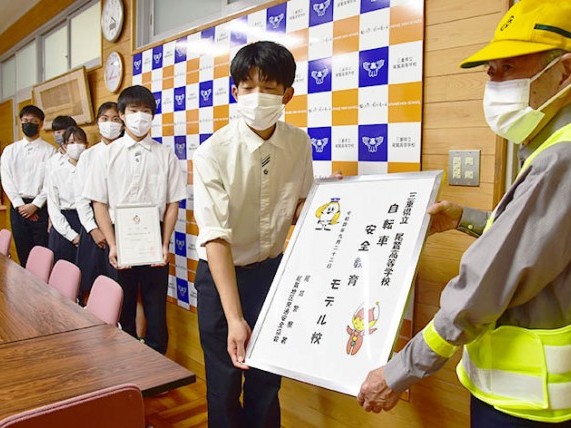三重県立尾鷲高校が22日、自転車安全教育モデル校の指定を受け、指定書の交付式が行われた。生徒会役員6人が参加。交付書とパネルを受け取った。 尾鷲署と尾鷲地区交通安全協会が、平成25年から年2... 続きを読む