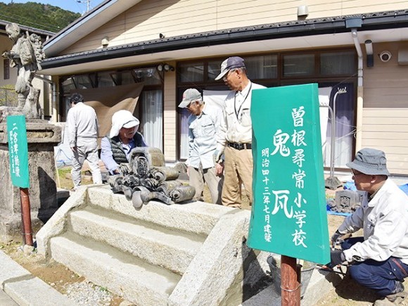 尾鷲市曽根町の曽根コミュニティーセンター前に16日、元曽根小校舎に使われていた鬼瓦や校庭にあった二宮尊徳(金次郎)の石像などが、卒業生ら地元有志によって据え付けられた。昭和29年に卒業した佐野茂機区長は「少しでも残すことができて... 続きを読む