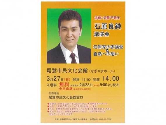 公益社団法人尾鷲文化振興会は3月27日(日)午後2時から、尾鷲市民文化会館で俳優で気象予報士の石原良純さんの講演会を開く。「石原家の家族愛&自然への想い」をテーマに語る。 ... 続きを読む
