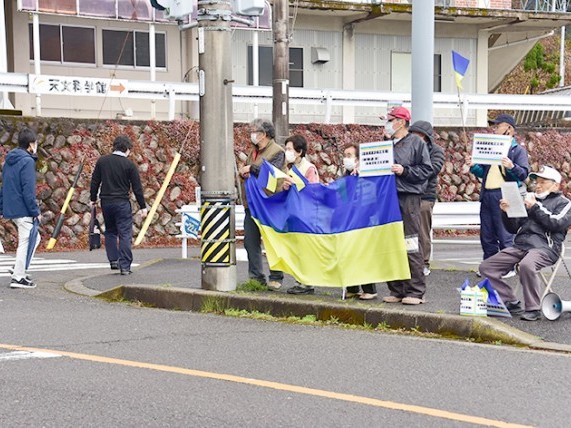 おわせ九条の会は23日、尾鷲市中村町の市役所前で、ロシアのウクライナ侵攻を批判する街頭活動を行った。会員ら15人が、青と黄で塗り分けられたウクライナ国旗の小旗などを持ち、平和を呼び掛けた。 ... 続きを読む