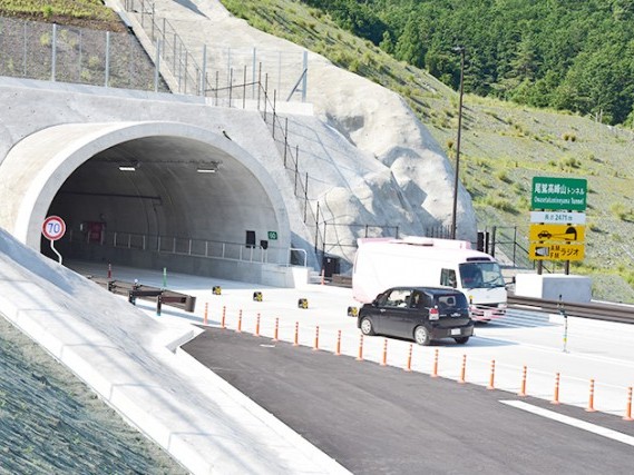 開通区間の尾鷲高峰山トンネル付近を通行する車両
