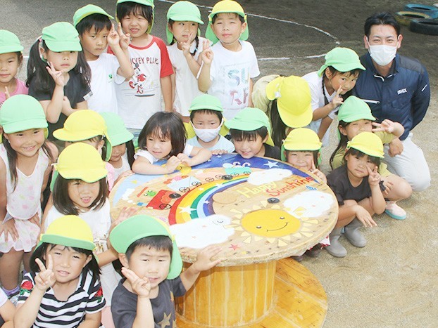絵を描いて寄贈した再利用テーブル=尾鷲第一保育園で