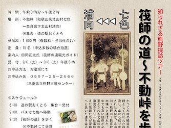 三重県立熊野古道センターは3月20日(土)、知られざる熊野探訪ツアー「筏(いかだ)師の道 不動峠を歩く」を行う=チラシ。和歌山県北山村の七色から、和歌山県と奈良県の境になっている不動峠を越えて奈良県下北山村の不動峠口バス停まで歩く。 ... 続きを読む