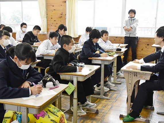 尾鷲市立尾鷲中学校は15日、土曜授業を行った。学年ごとに外部講師による講義や体験に取り組んだ。1年生と3年生は学校運営協議会の企画で、このうち1年生は尾鷲ロータリークラブの4人が担当。生徒たちは、講師の仕事や尾鷲への思いについて... 続きを読む