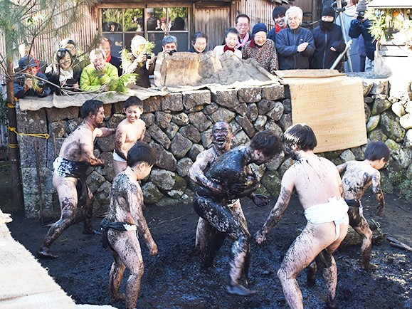 尾鷲市九鬼町の伝統行事「にらくら祭り」がこのほど行われ、炭泥を掛け合って今年一年の無病息災と大漁を祈願した。 漁師が海でウニを踏んでけがをしないように焼き払って供養したことが始まりとされ、3... 続きを読む