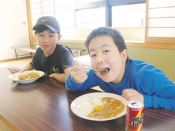 手作りカレーを味わう児童