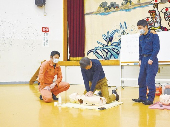 新宮市の三輪崎区は21日、三輪崎会館で救命講習会とミニ消火栓の取り扱い訓練を実施。新宮市消防本部の職員を講師に招き、役員と組長が心肺蘇生法や消火栓の使い方などを練習した。 救急車... 続きを読む