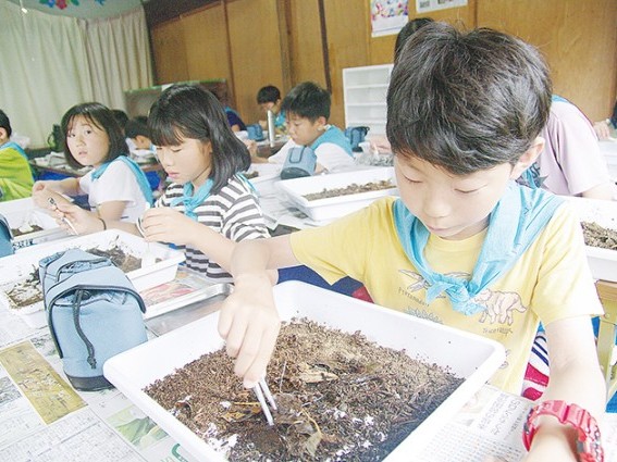 土の中の生物をより分け観察した