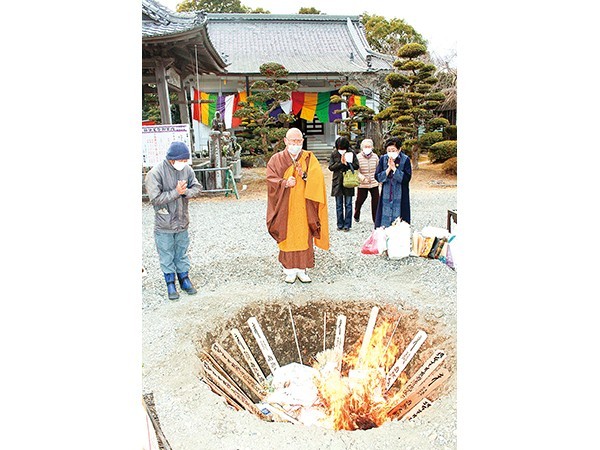 新宮市新宮、高野山真言宗丹鶴山東仙寺ではこの日、朝から同寺の真言密教星祭「厄除(やくよけ)祈祷」「星祭祈祷」があり、夕方には信者や信徒などがしめ縄や古いお札などを持ち込んで、本堂前の穴に投入して焚き上げる「どんど焼き」が行われた... 続きを読む