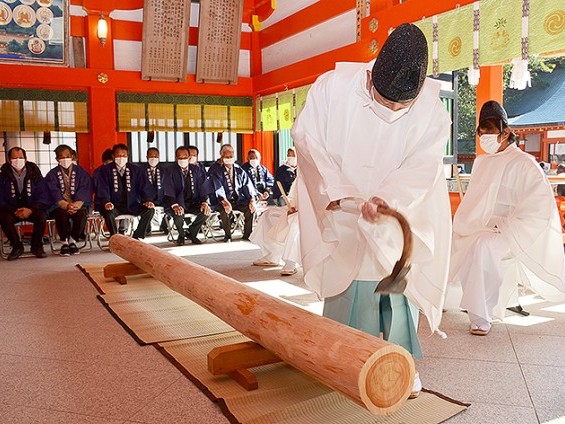 新宮建築組合は4日、熊野速玉大社で「釿始式」(ちょんなはじめしき)を営んだ。17人が参列。ヒノキの丸太に釿を振るい、業界発展や平穏無事などを願った。 釿(ちょんな/... 続きを読む