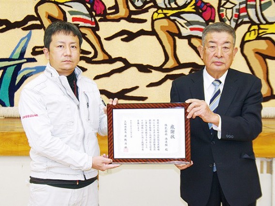 避難経路整備に感謝状 三輪崎区から海邊組へ