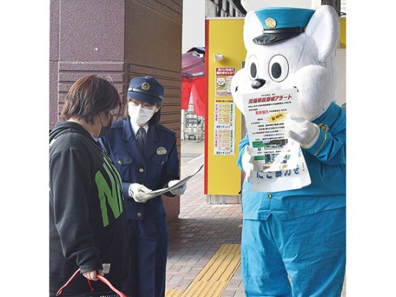 買い物客にチラシを示しながら啓発する署員