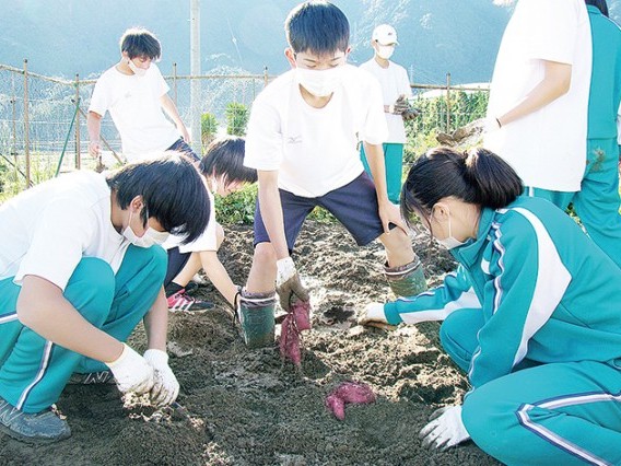 30日の交流会で実食 新宮市立熊野川中学校の2年生14人は9日、同校の畑で、「チームくまのがわ」の地域