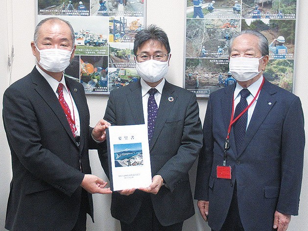 井上水管理・国土保全局長(中)に要望した田岡会長(左)と西田副会長(新宮市提供)