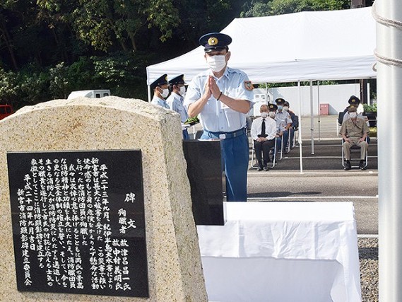 新宮市消防本部は4日、同本部西側駐車場の消防顕彰碑前で「消防安全の日の誓い」を開催した。越水薫消防長はじめ職員と、消防団から竹内由定団長、田岡実千年市長の計20人が参列し、紀伊半島大水害で殉職した消防団員2人をはじめ犠牲者の冥福... 続きを読む
