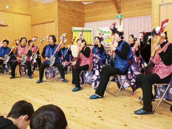 園児ら演奏楽しむ 新宮市立丹鶴幼稚園で2月28日、スコップ三味線の鑑賞会があった。JAみくまの女子会スコップ三味線サ