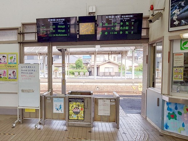 JR熊野市駅の改札付近に記された案内(14日午前7時40分ごろ)
