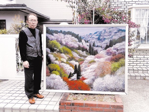 日ごろの創作活動実る 太地町在住の増田綱紀さん(75)の描いたサクラの絵画が