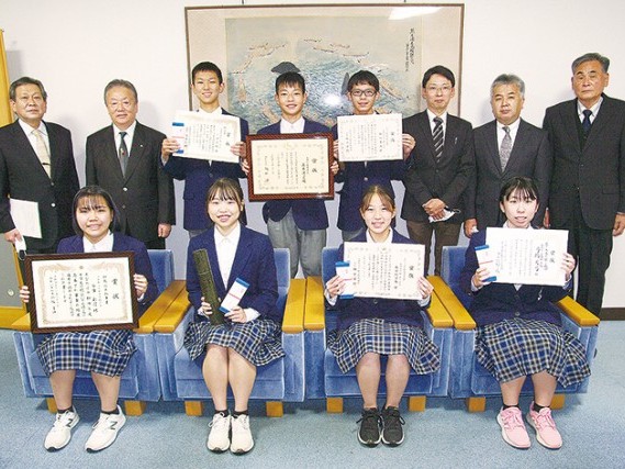 税についての作文などで受賞した太地町立太地中学校の生徒ら7人が24日、町役場を訪れ、報告会および記念品贈呈で三軒一高町長はじめ町からの祝福を受けた。 この日役場を訪... 続きを読む