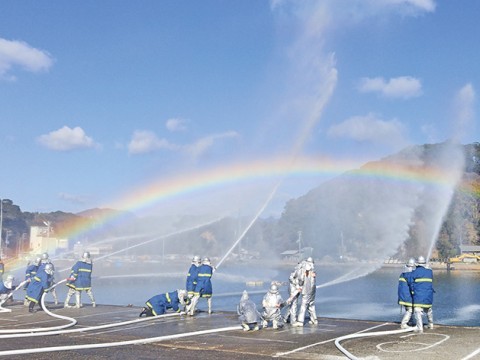 一斉放水で練度披露 太地町消防出初め式が5日、同町東の浜(太地港ふれあい広場)で行われた。同町消防団(筋師光博団長)