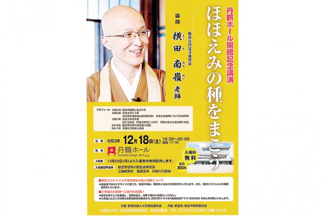 新宮市健人大学運営委員会は12月18日(土)の午後6時30分~8時(開場5時30分)、丹鶴ホールで、横田南嶺老師による講演「ほほえみの種をまこう」を開催する。新宮市、市教育委員会共催。入場券は22日(月)から先着800枚無料配布する。配布場所は、市役所生涯学習課(市役所2階)、各支所・行政局。