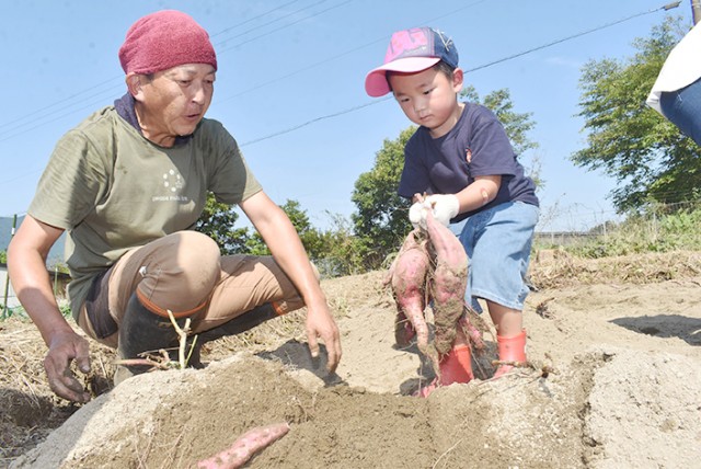 参加した親子は「大きいのを掘るぞ」と気合十分。大きなイモがついていそうなツルに当たりをつけると、周りの土をかき分けた後、イモを引っ張り上げた。中には顔より大きいイモを掘り当てて「すごく大きい」と大喜びする子もいて、「家に帰って食べたい」「スイートポテトにして」とさっそくおねだりしていた。
