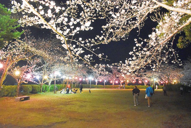 桜が見頃を迎えている丹鶴城公園(新宮城跡)では現在、ライトアップが行われており、夜桜を楽しむ人たちでにぎわっている。点灯時間は午後6時~同11時。期間は4月28日(金)までの予定だが、桜の開花状況によって予告なしに期間を変更する場合がある。